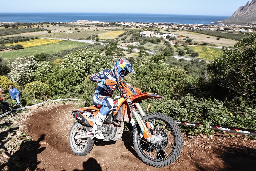 Josep García, de Red Bull KTM, aguanto la presión de Steve Holcombe, de Sherco Racing, para llevarse la victoria en la primera jornada el día sábado en Sicilia. Holcombe fue segundo en su debut con Sherco, con Verona tercero por delante de Magain.